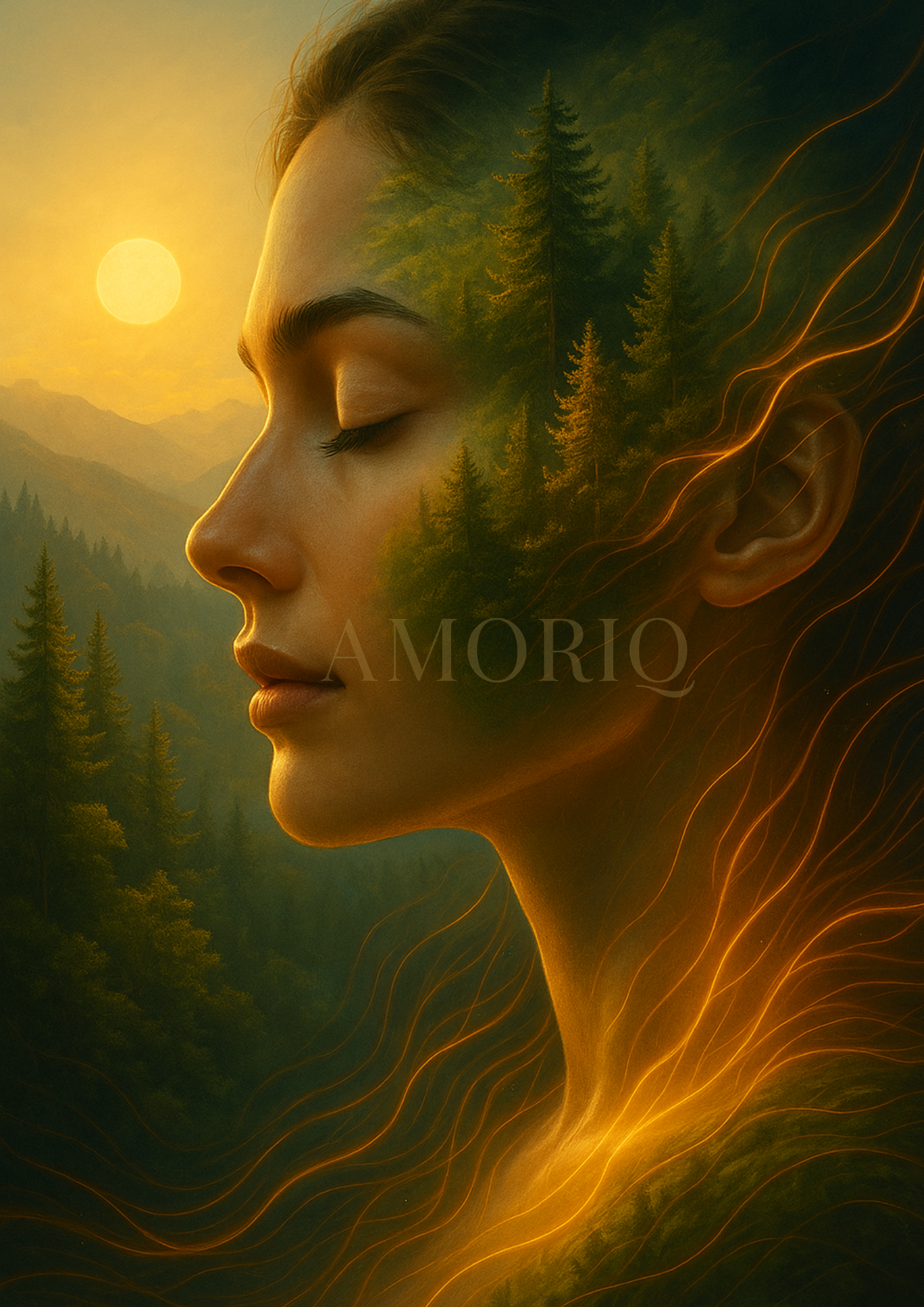 A photorealistic double-exposure art print in which a serene woman merges with a pine forest. Warm golden lines suggest breath, stillness, and a connection with nature.